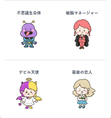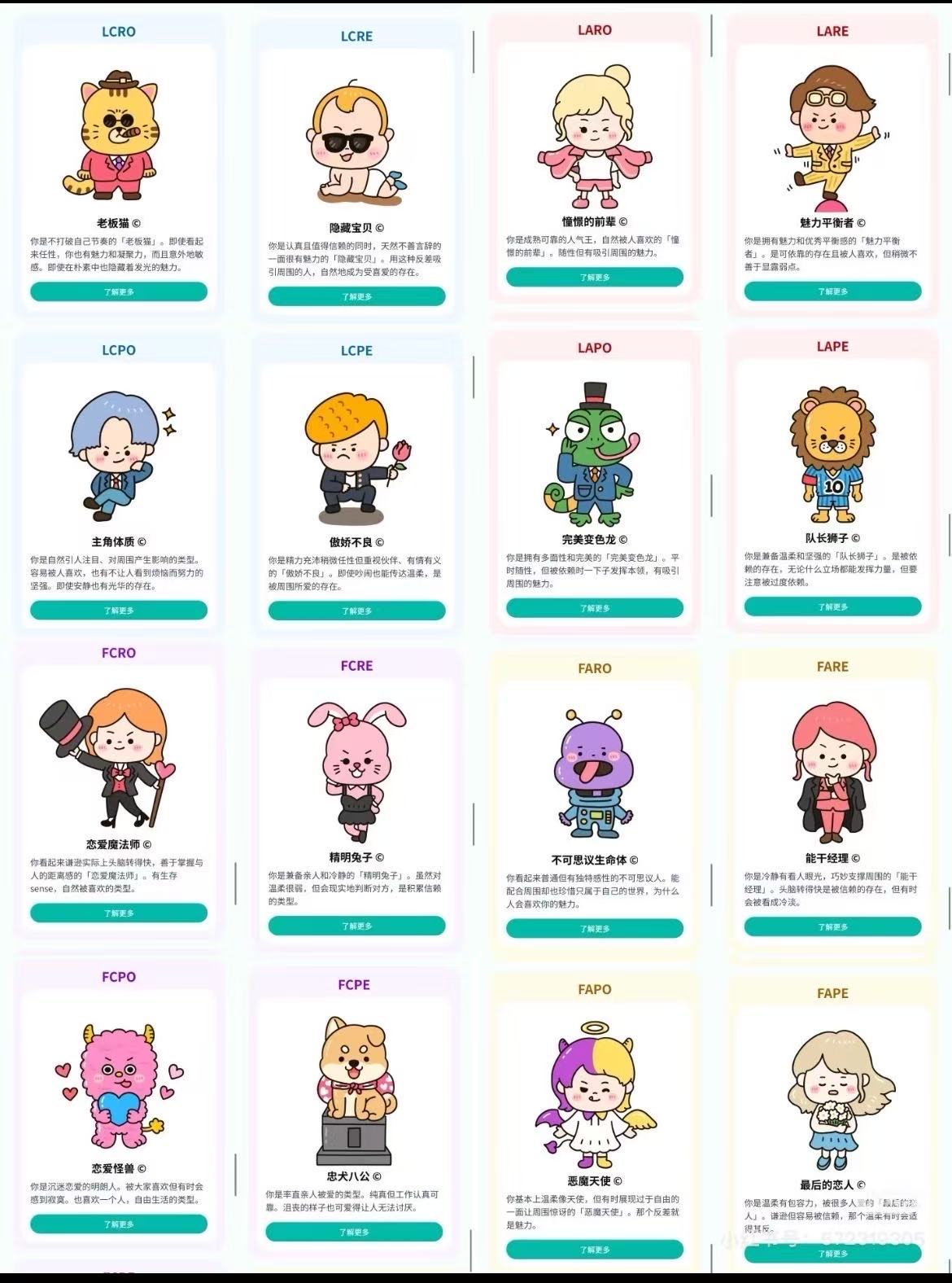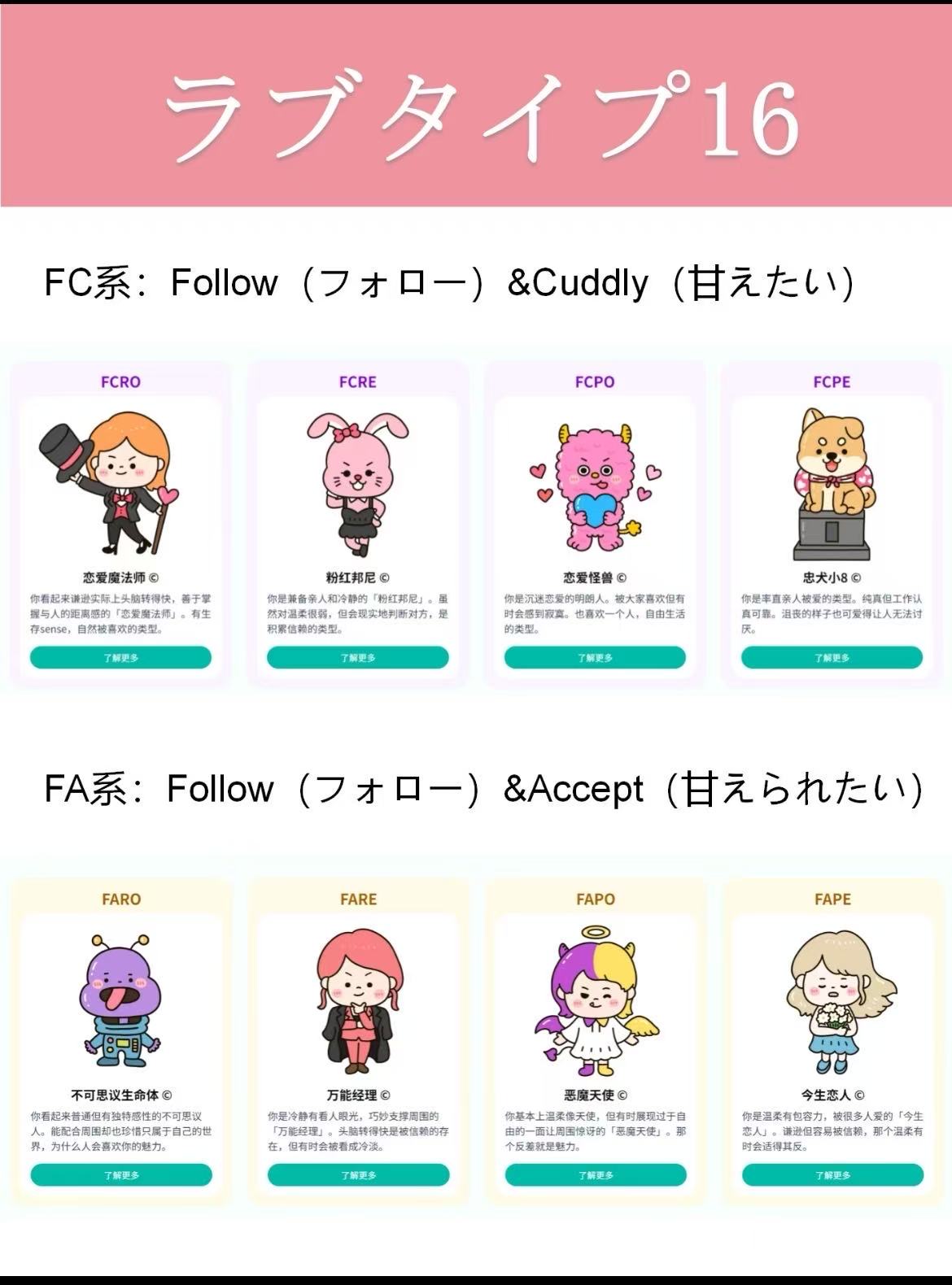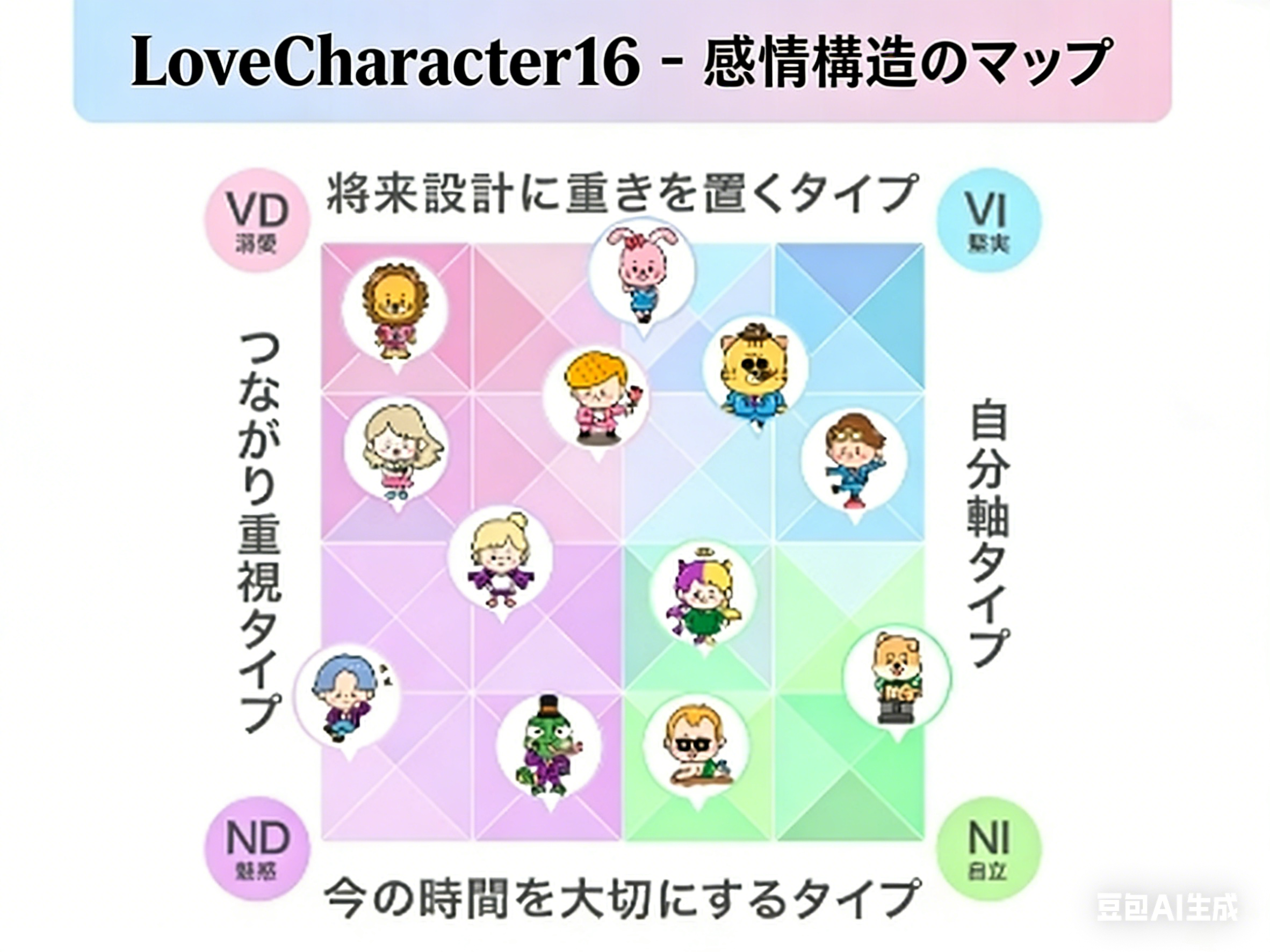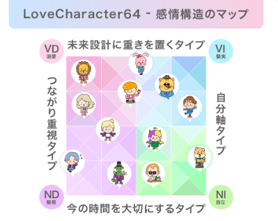 64 種類のキャラクターから 16 種類に絞り込んだバージョンで、よりシンプルに自分の恋愛スタイルを把握できます。